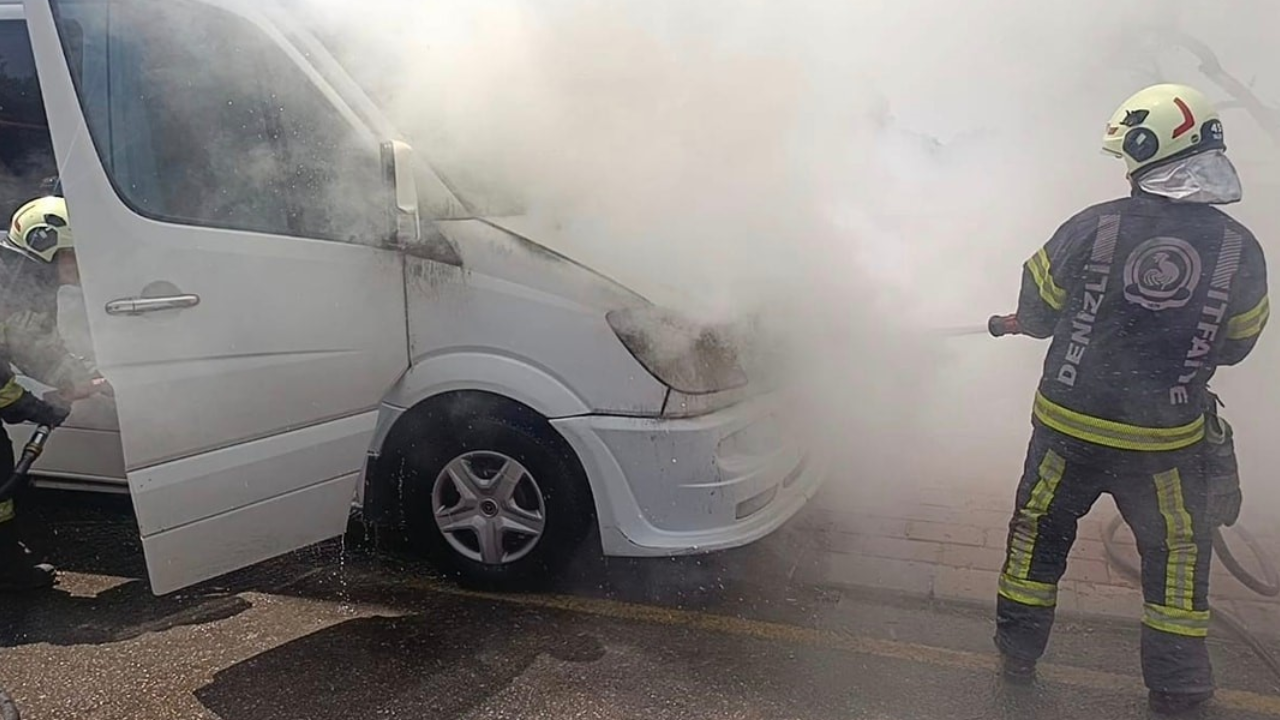 Denizli’nin Pamukkale ilçesi Aktepe Mahallesi’nde seyir halindeki emekçi servisi minibüs, bir anda dumanlar yükselmeye başlayınca alev aldı. Sürücü minibüsü inançlı bir alana çekerek çabucak itfaiyeye haber verdi.